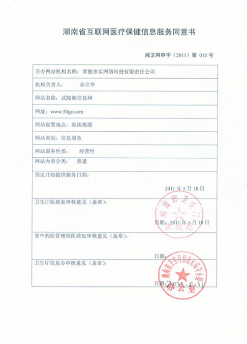 2011年5月31日,我公司獲湖南省衛(wèi)生廳批準(zhǔn)通過“武陵閣信息網(wǎng)”(www.50ge.com)開展互聯(lián)網(wǎng)醫(yī)療保健信息服務(wù)(湘衛(wèi)網(wǎng)申字(2011)第010號),這為我公司進(jìn)一步拓寬了發(fā)展空間。